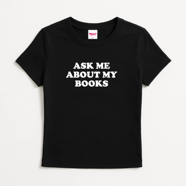 Se você é apaixonado(a) por livros e quer mostrar isso no seu estilo, a baby tee Ask Me About Books é a escolha perfeita para você! Dê um toque literário ao seu visual e incentive conversas sobre o universo das páginas.