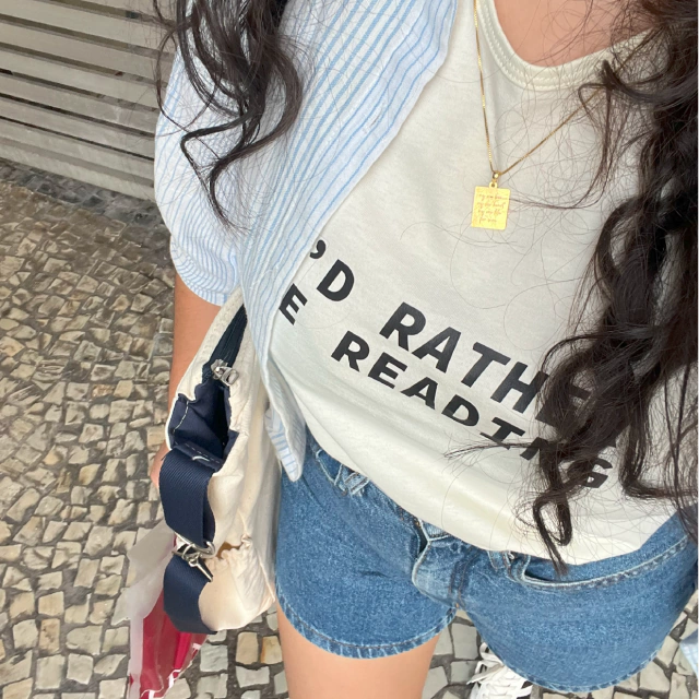 Feita com um tecido leve e macio, a baby tee oferece uma sensação de aconchego durante todo o dia, permitindo que você se sinta confortável e estilosa, não importa onde vá. Seu design moderno e ajustado valoriza o corpo de maneira sofisticada, enquanto o slogan "I'd Rather Be Reading" expressa de forma descomplicada o seu verdadeiro desejo de mergulhar em um bom livro.