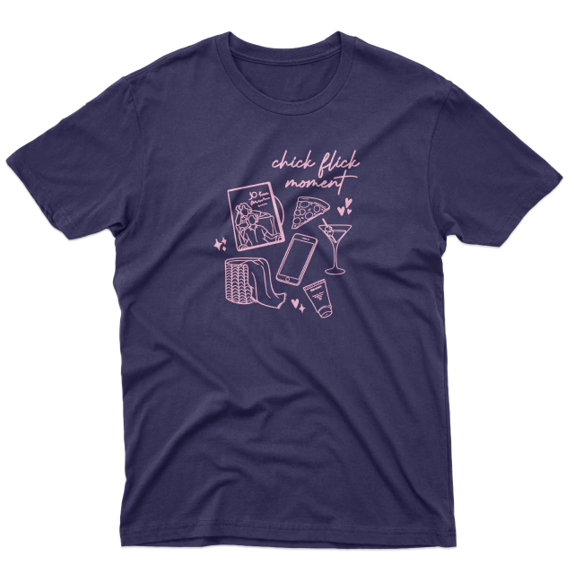Camiseta Chick Flick feita especialmente para quem ama viver o momento girly girl: aquele instante mágico de assistir filmes de romance, rodeada pela sua comida favorita, bebida queridinha e um ritual de skincare que a gente adora. Pensada para ser o seu companheiro perfeito nessas horas de aconchego e diversão.
